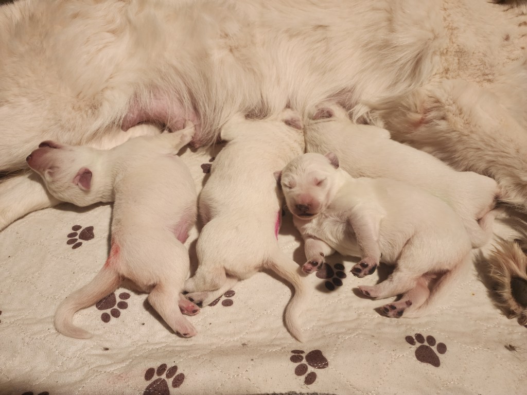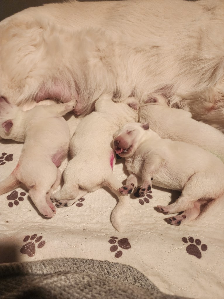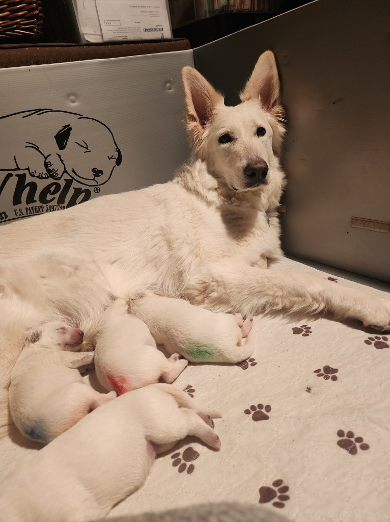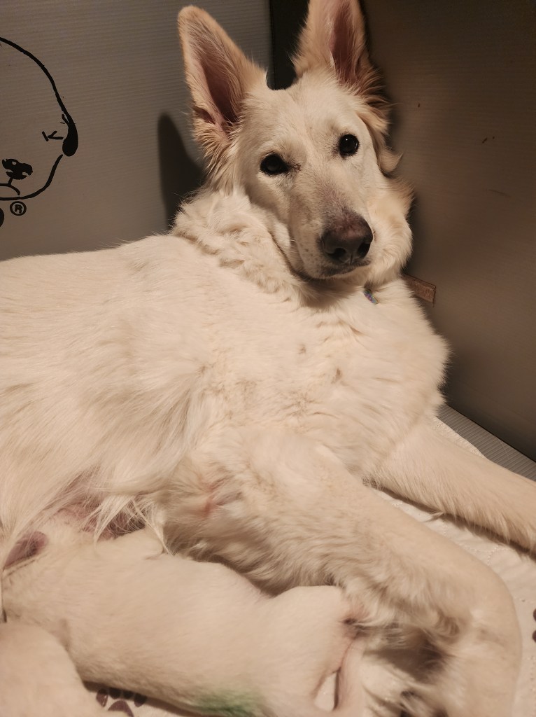 Vanna x Niko pairings have been fan favorites and we are going to do one more, so this will be their last litter together! Niko and Vanna are both full Berger Blanc Suisse registered with UKC. They have produced such wonderful babies, some becoming service dogs as well. One of them is a seeing eye dog which I think is super cool lol, and a couple others have become service dogs. There may be more out there but not everyone tells me everything so who knows! 😉 She had her babies on 3/8/26. This is the Dumbo litter! There are none available at this time!
