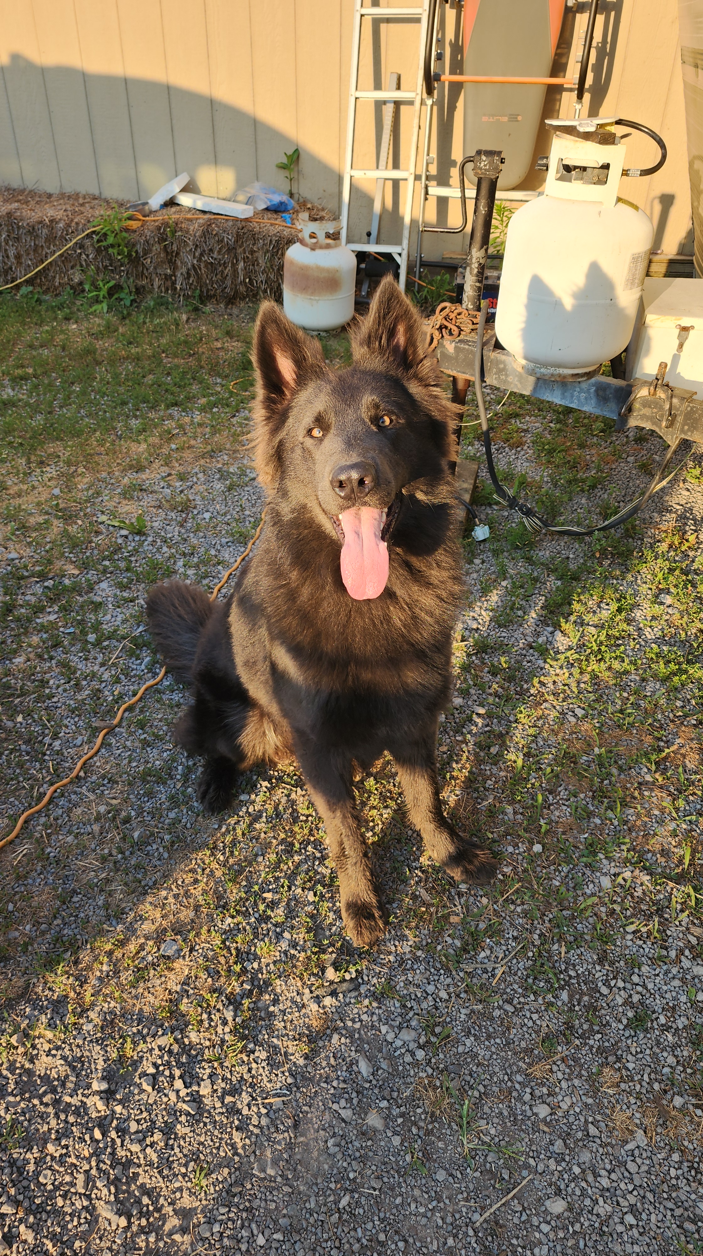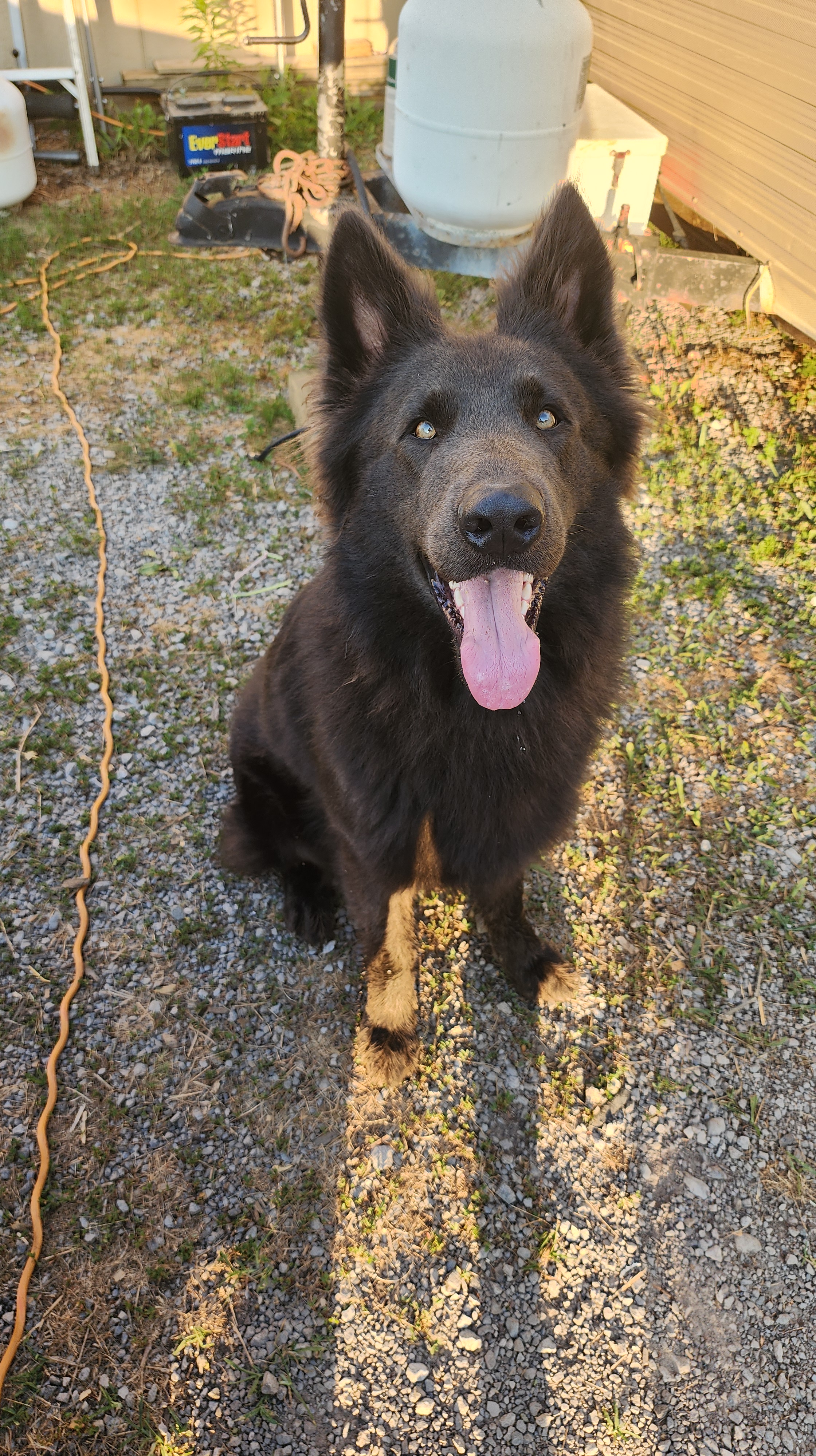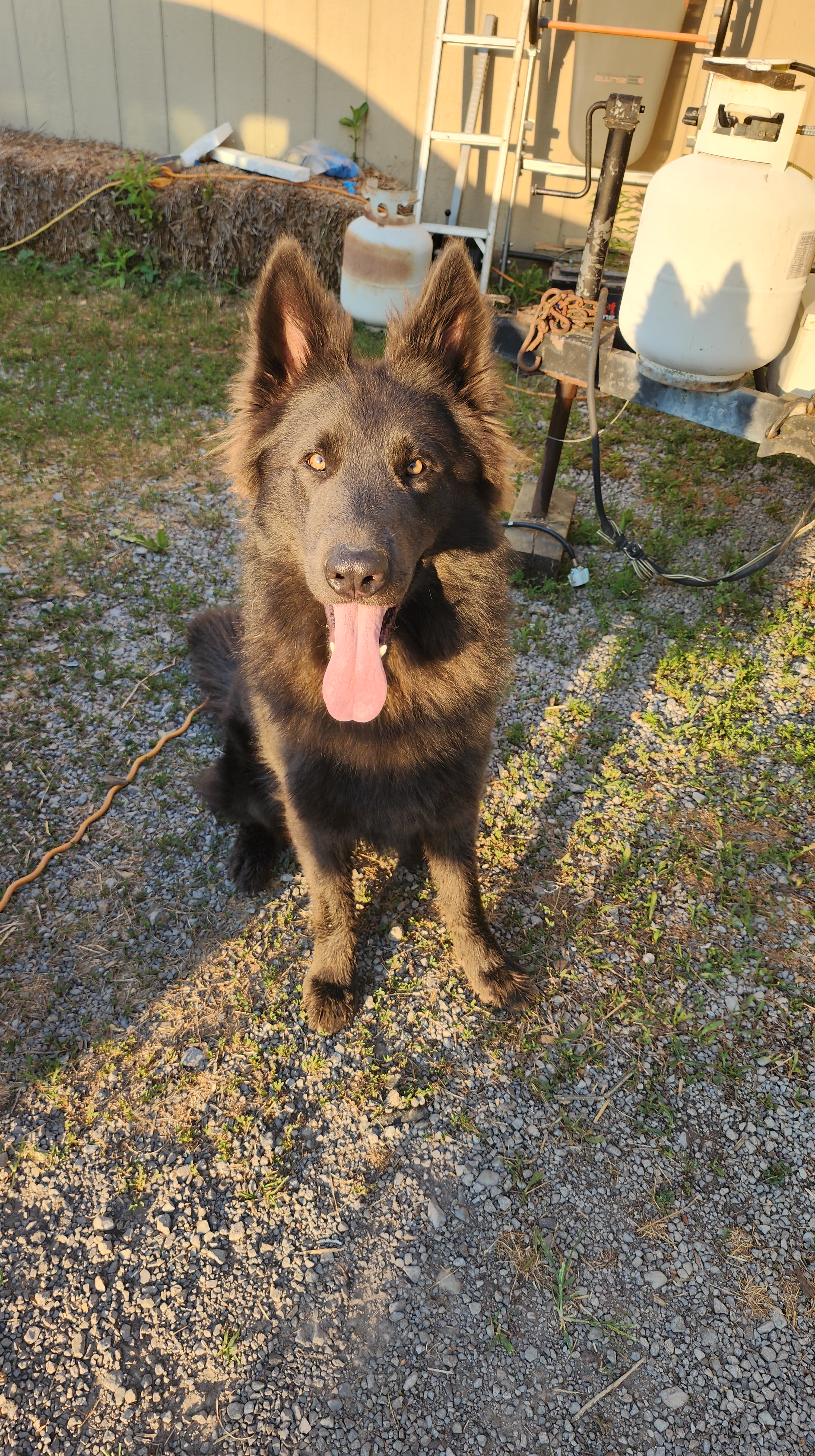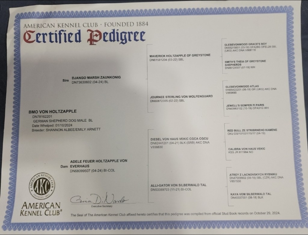 Pronounced “Bee-Moe”, which is a character off one of my favorite cartoons, Adventure Time. This little guy is my biggest baby! He is from Zelda x Django pairing, which also makes him Ruka’s sibling. He is a solid blue long coat and I have been waiting for YEARS for a pup like him! He is so much like his Uncle Tiago, it makes my heart melt! His looks, and quirky personality, he’s just so awesome. He is also our puppy sitter lol, he just loooves playing with the puppies and its so cute to watch! He loves kisses from his mama soooo much. I like to put my face on his forehead and tell him how much I love him, and it makes him so happy. He passed his Pennhip with flying colors and got EXCELLENT with the highest scores i’ve seen i’m so happy! He got a 0.20 in both hips! He passed OFA prelim elbows as well. He has a full Pawprint genetics health panel done and clear of everything. He is in the process of getting his BH and other titles at a trainers, so hopefully in September 2025 he will be fully titled 🙂