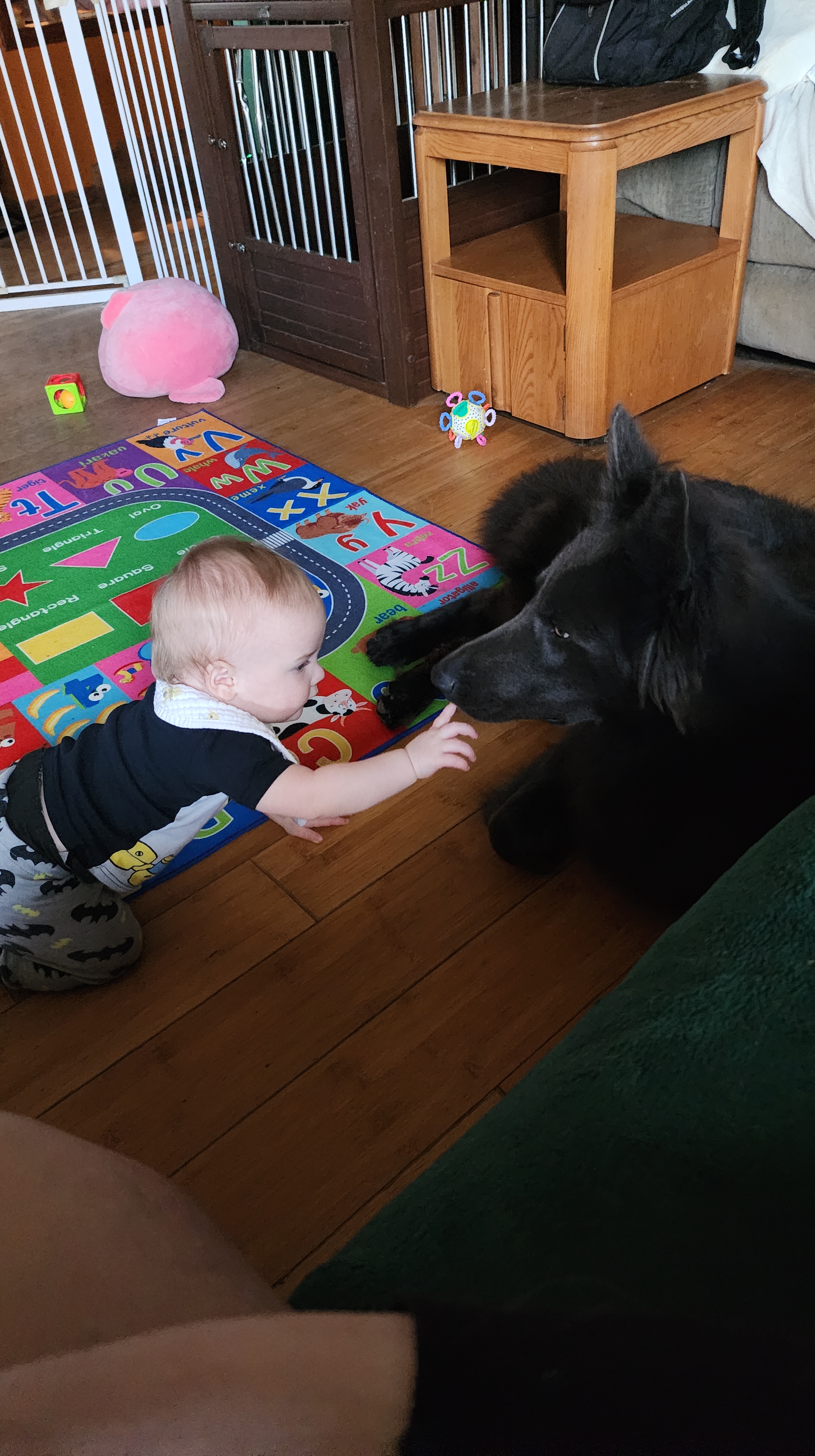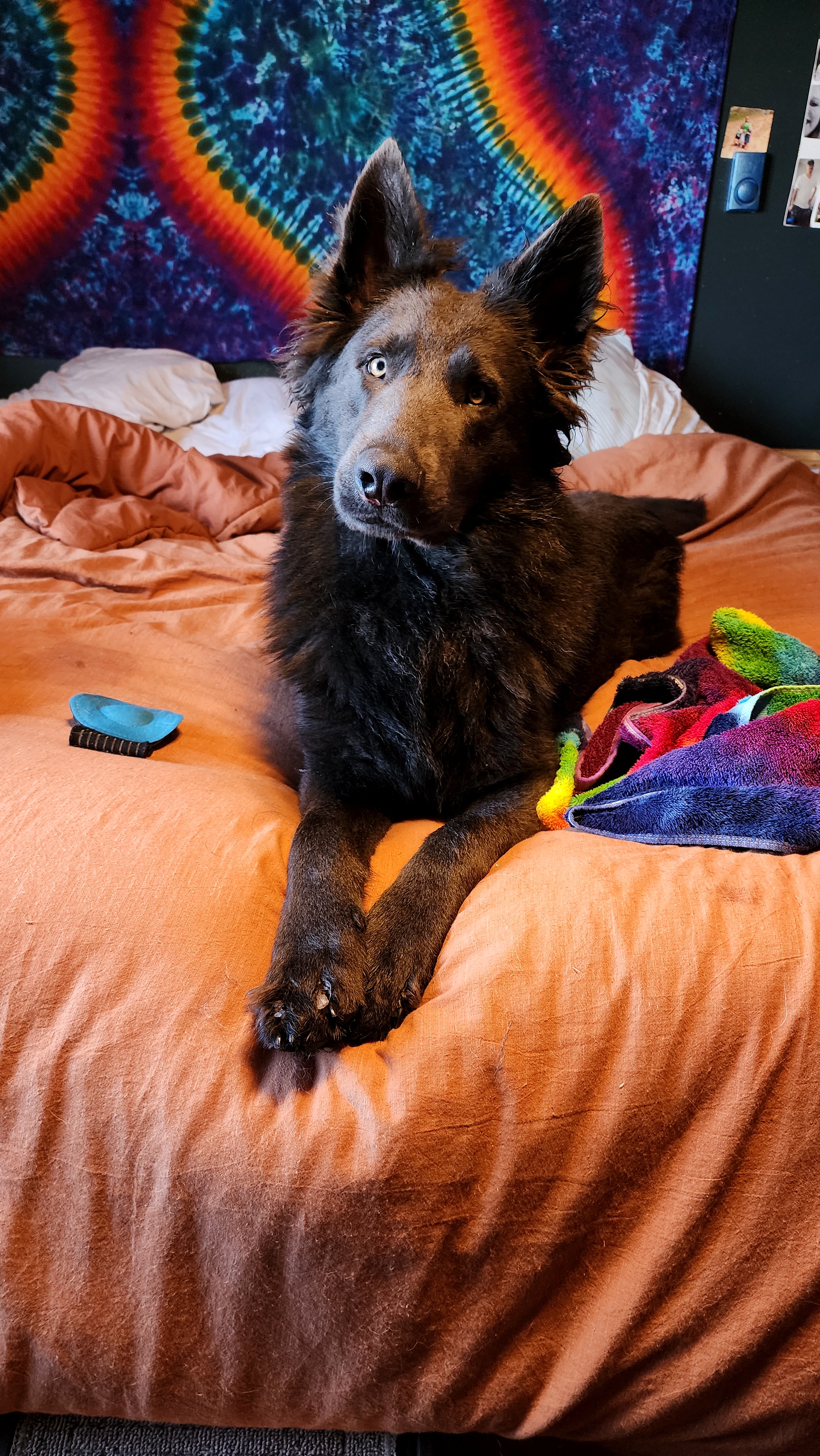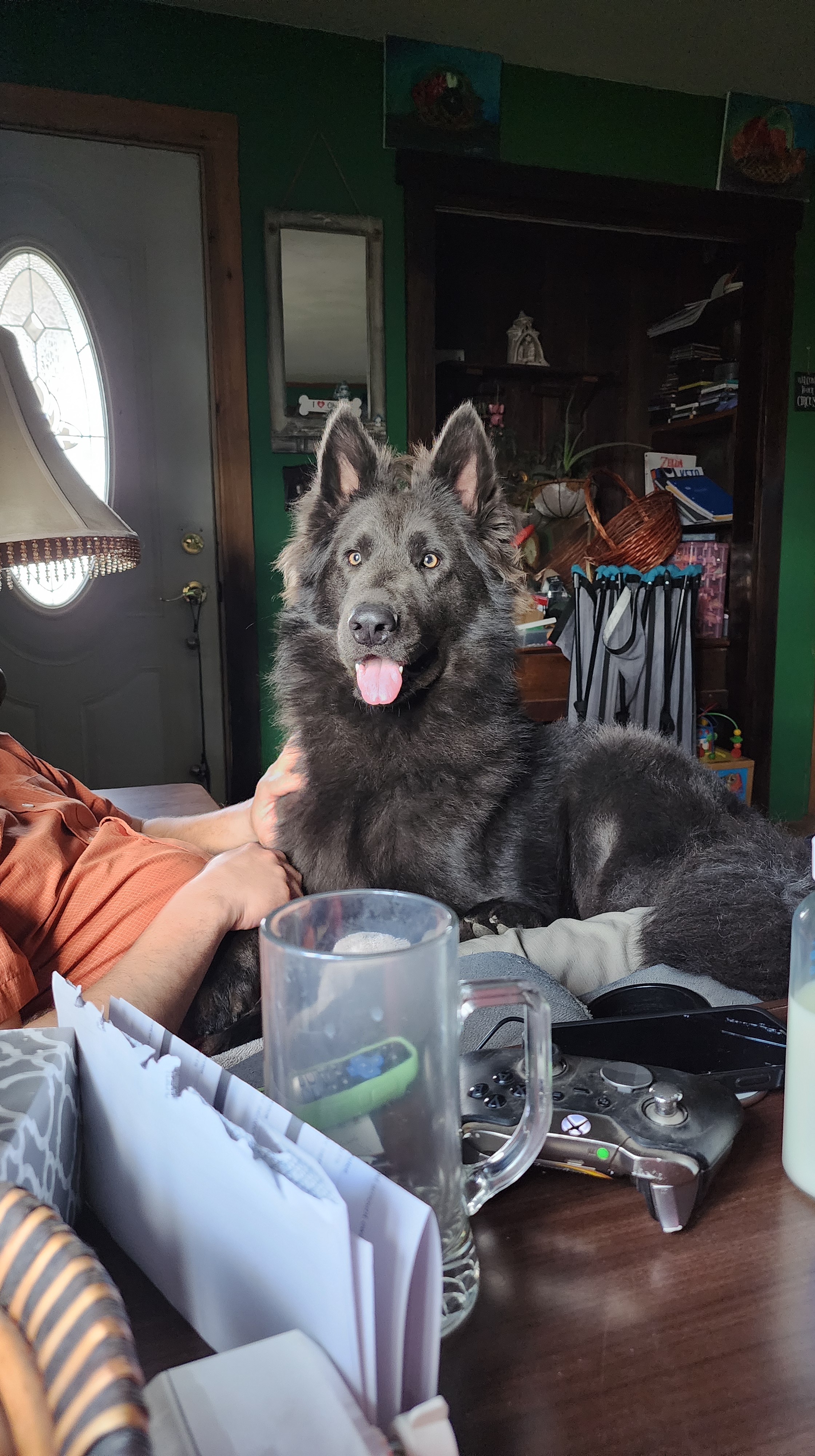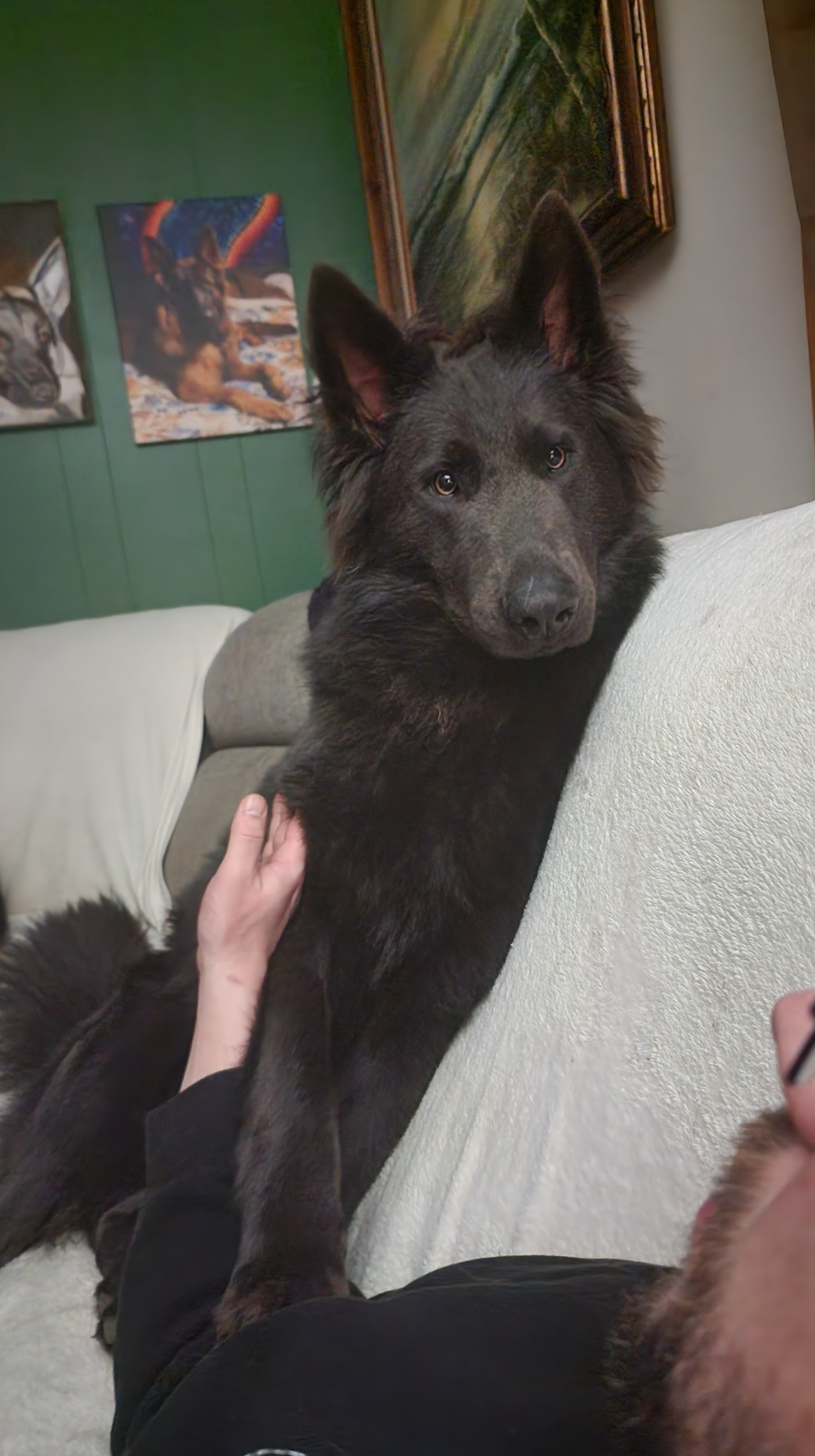 Pronounced “Bee-Moe”, which is a character off one of my favorite cartoons, Adventure Time. This little guy is my biggest baby! He is from Zelda x Django pairing, which also makes him Ruka’s sibling. He is a solid blue long coat and I have been waiting for YEARS for a pup like him! He is so much like his Uncle Tiago, it makes my heart melt! His looks, and quirky personality, he’s just so awesome. He is also our puppy sitter lol, he just loooves playing with the puppies and its so cute to watch! He loves kisses from his mama soooo much. I like to put my face on his forehead and tell him how much I love him, and it makes him so happy. He passed his Pennhip with flying colors and got EXCELLENT with the highest scores i’ve seen i’m so happy! He got a 0.20 in both hips! He passed OFA prelim elbows as well. He has a full Pawprint genetics health panel done and clear of everything. He is in the process of getting his BH and other titles at a trainers, so hopefully in September 2025 he will be fully titled 🙂