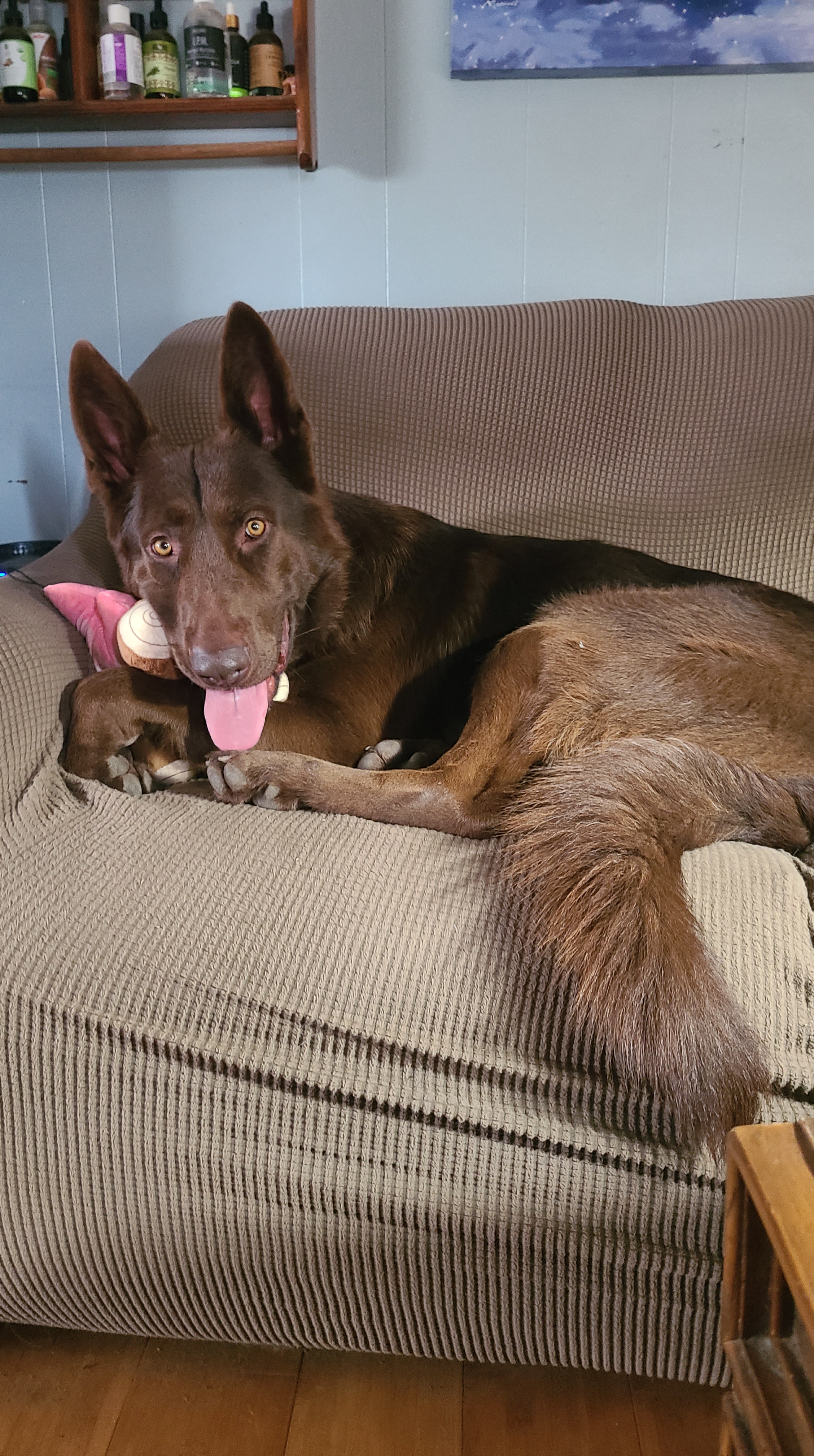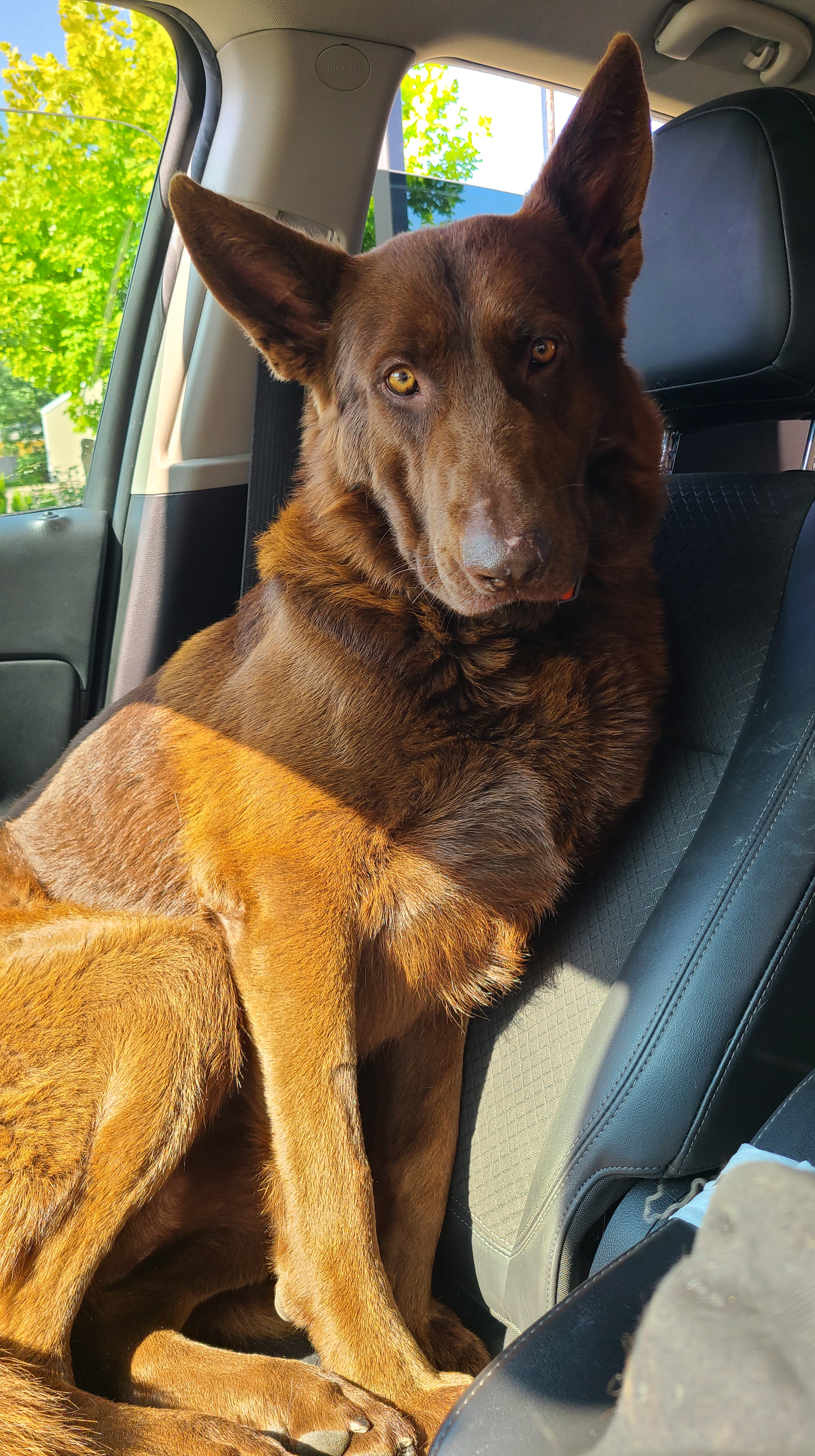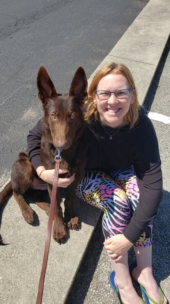 Chewy is our first liver GSD. He is liver seal stock coat. He is perfect in every way! I preferred a long coat, but he is a long coat carrier instead. His personality is awesome, he’s nosy, nerves of steel, friendly, loveable, I can do anything with him and take him anywhere, he is very eager to please and a quick learner. He is absolutely my very best friend and we do everything together! He is doing great in scentwork, and hoping he will be a SAR dog! He has passed ALL health tests thru Embark, except being a DM carrier! He did not pass the Paw Prints testing for carrying dwarfism unfortunately, so he is a carrier. Passing hip xrays with Pennhip score of 0.52 on left and right 0.39 (fair) and prelim OFA elbows passing, as well as passing OFA heart, patella, and dentition! Due to him being a Dwarfism carrier, having fair hips, and also the Brody blue, I have decided that it is time to retire my baby! We had 2 litters with him and kept a couple of his offspring that are clear of everything 🙂 He will obviously remain with us forever and ever!