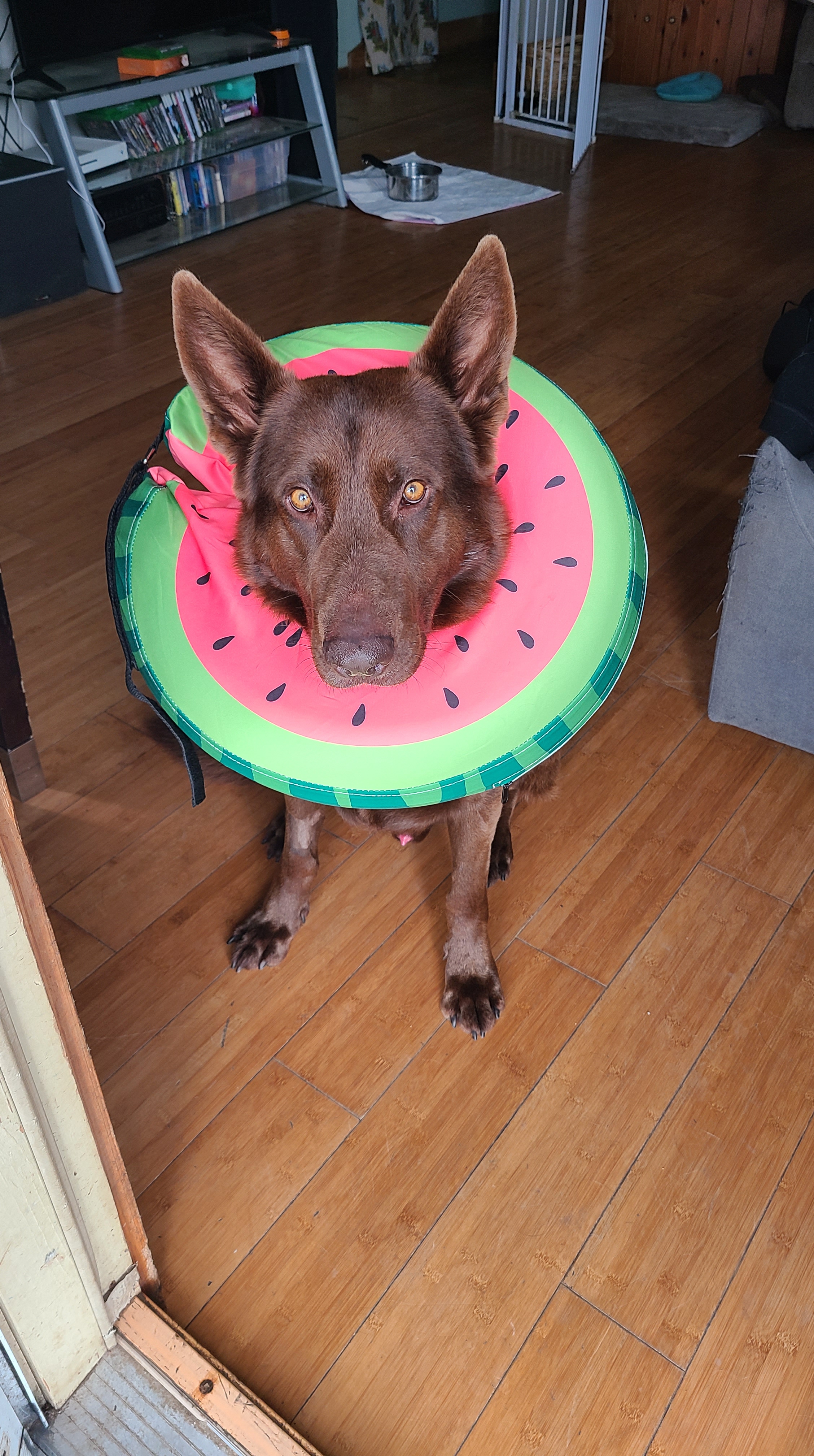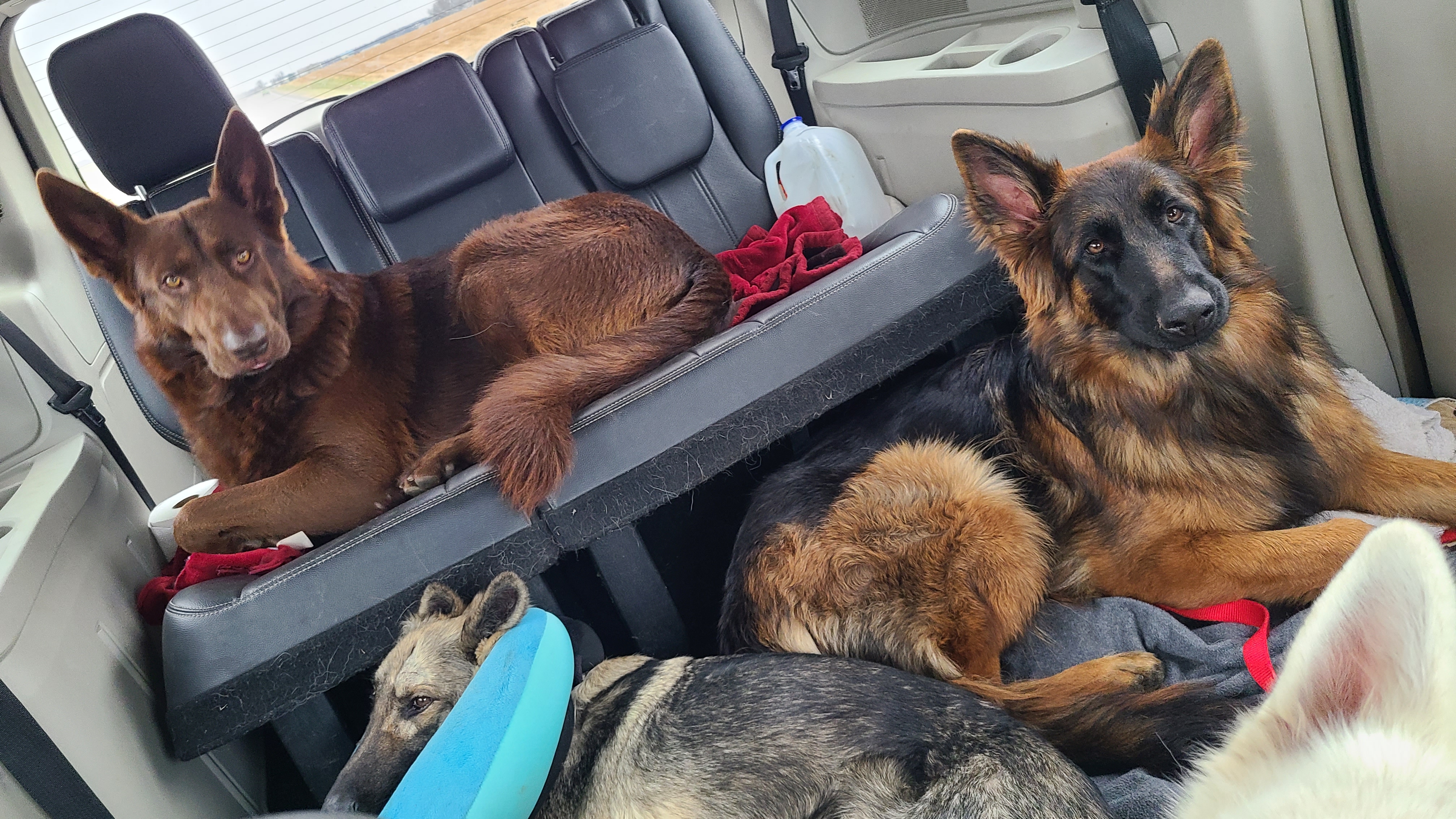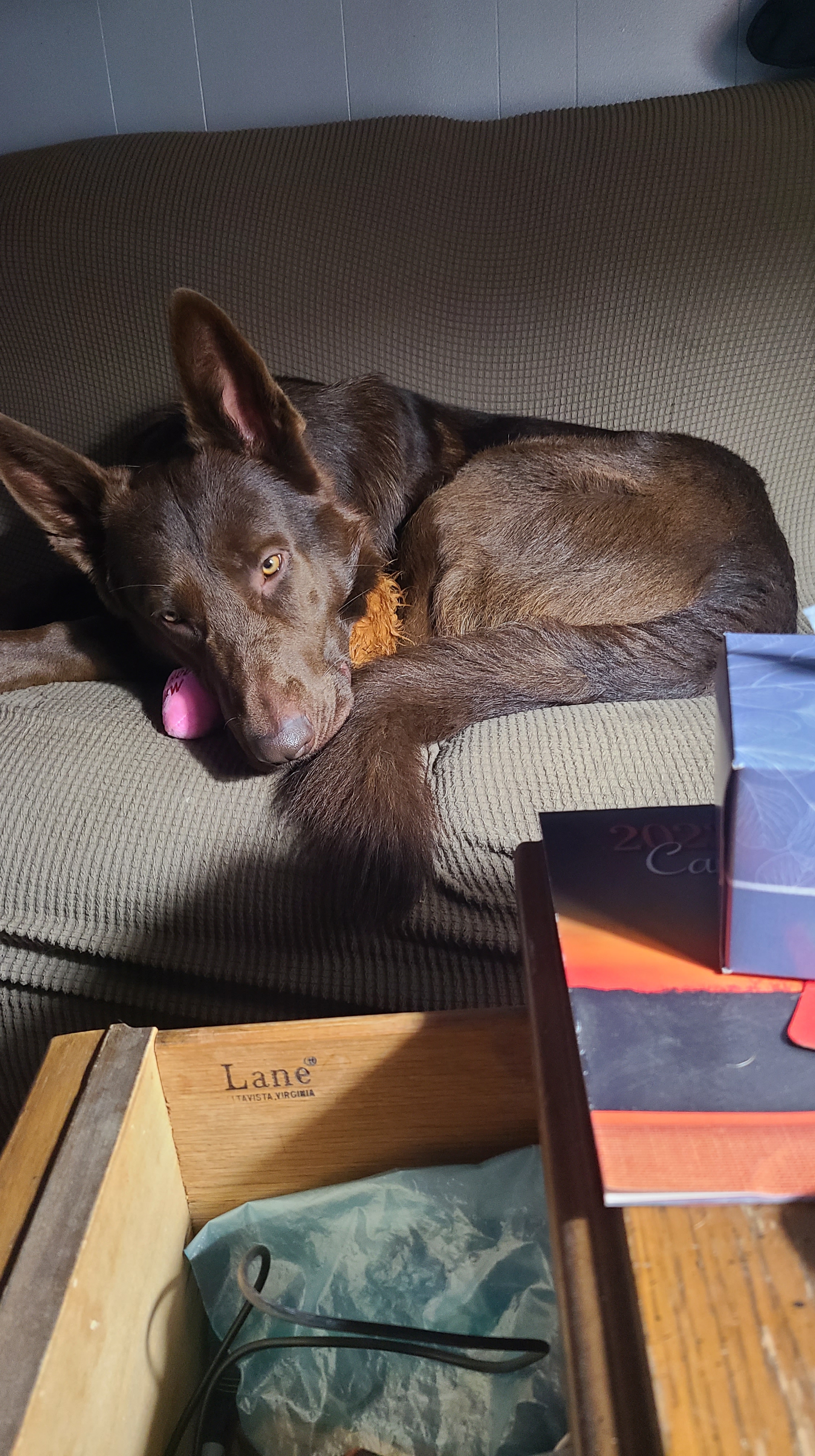 Chewy is our first liver GSD. He is liver seal stock coat. He is perfect in every way! I preferred a long coat, but he is a long coat carrier instead. His personality is awesome, he’s nosy, nerves of steel, friendly, loveable, I can do anything with him and take him anywhere, he is very eager to please and a quick learner. He is absolutely my very best friend and we do everything together! He is doing great in scentwork, and hoping he will be a SAR dog! He has passed ALL health tests thru Embark, except being a DM carrier! He did not pass the Paw Prints testing for carrying dwarfism unfortunately, so he is a carrier. Passing hip xrays with Pennhip score of 0.52 on left and right 0.39 (fair) and prelim OFA elbows passing, as well as passing OFA heart, patella, and dentition! Due to him being a Dwarfism carrier, having fair hips, and also the Brody blue, I have decided that it is time to retire my baby! We had 2 litters with him and kept a couple of his offspring that are clear of everything 🙂 He will obviously remain with us forever and ever!