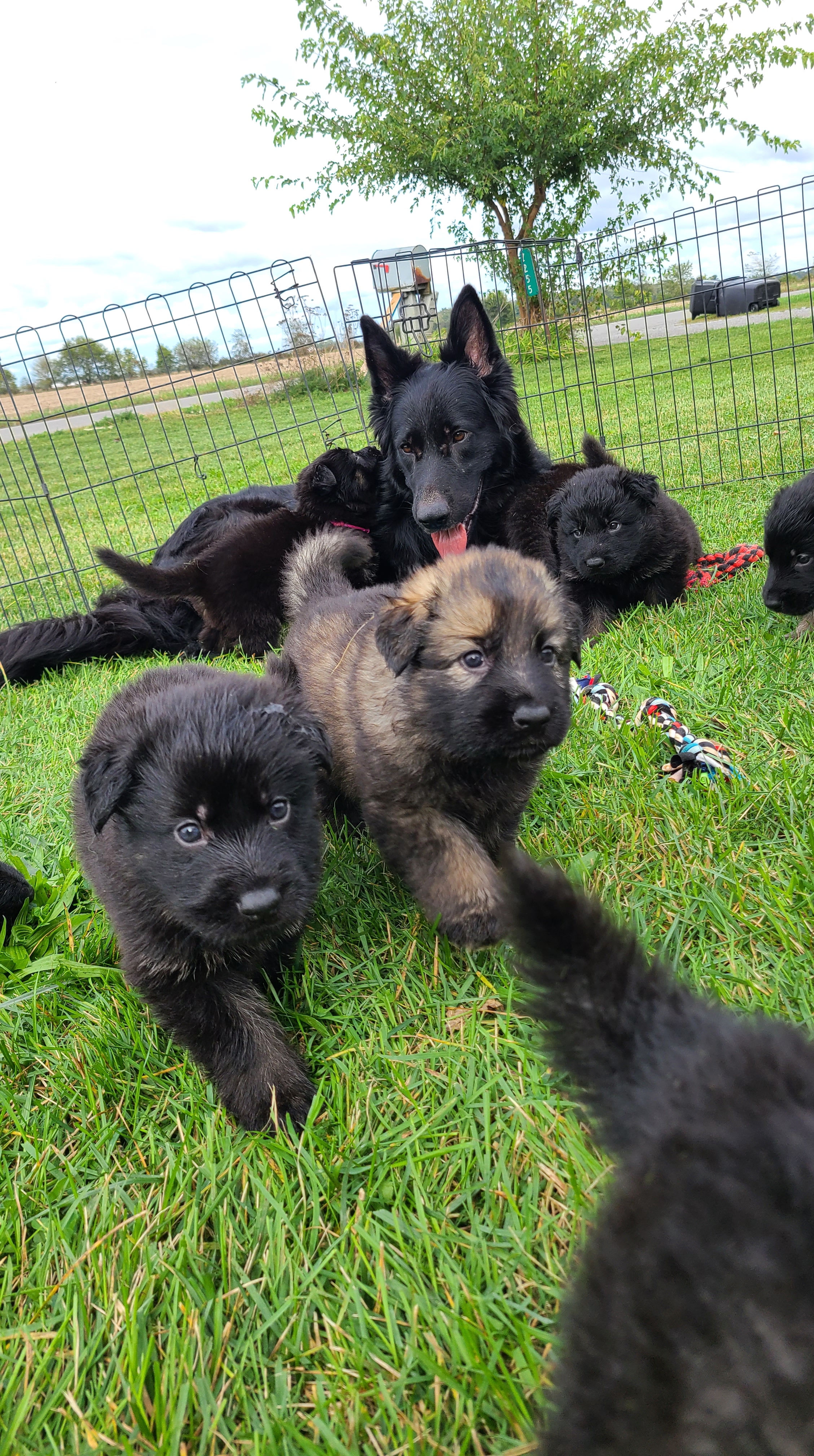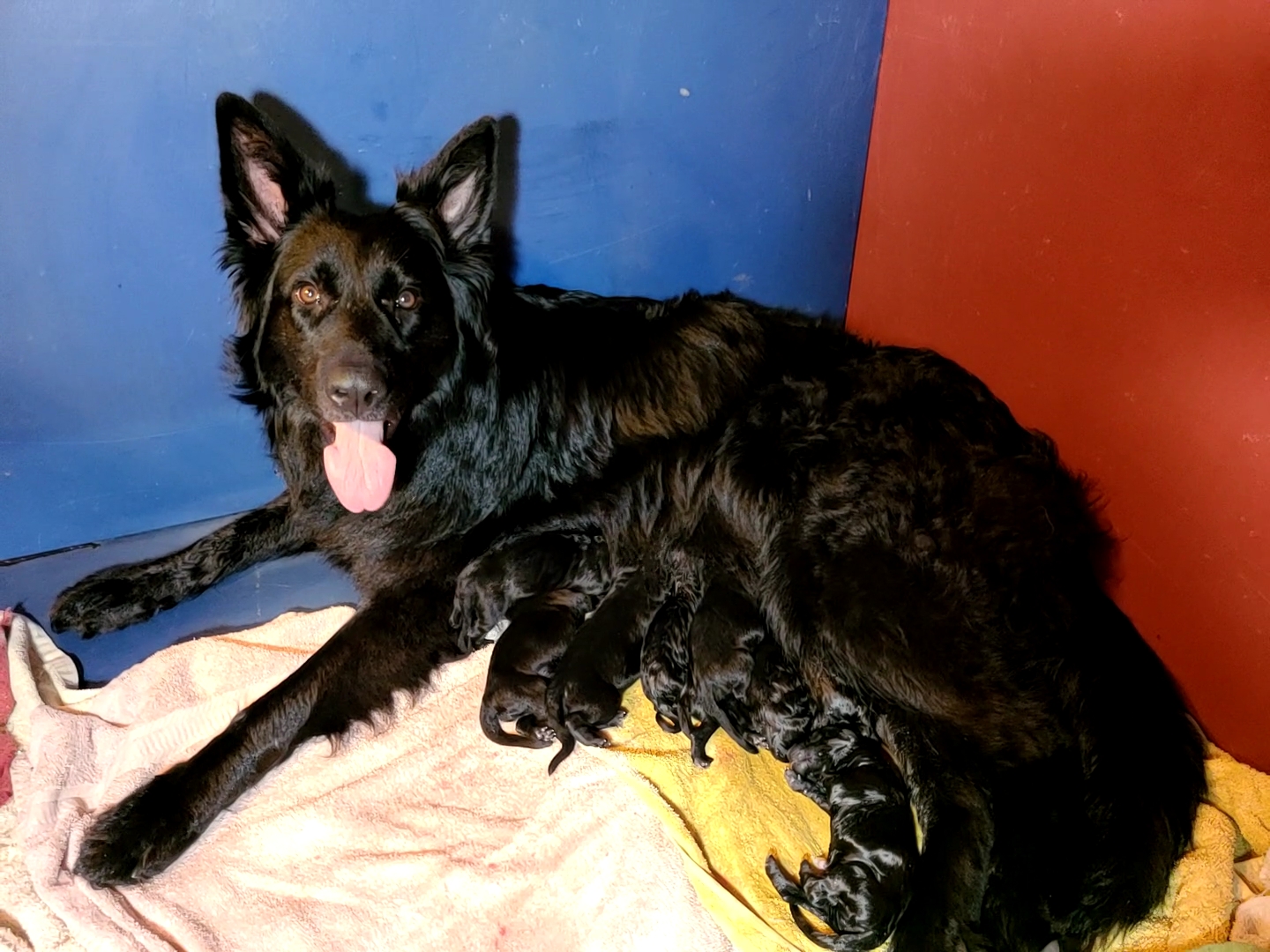 Luna was our black long coat working lines female. She is very a headstrong and stubborn brat lol. I love her expressions. She is full working line, but is very lazy inside the house lol. Her favorite things to do are to be petted and play ball. She is very sweet and loves people… a little too much sometimes lol. If you’re not petting her, then you are wrong and she will make sure to correct the problem! She was not meant to be a guard dog LOL. She loves the snow and winter is her favorite time! She was one of the best mommy’s ever and looooooved her babies so much! She always wanted to be around them and play with them and care for them. She has retired and is living the best life in her forever home and they love her very very very much!!!