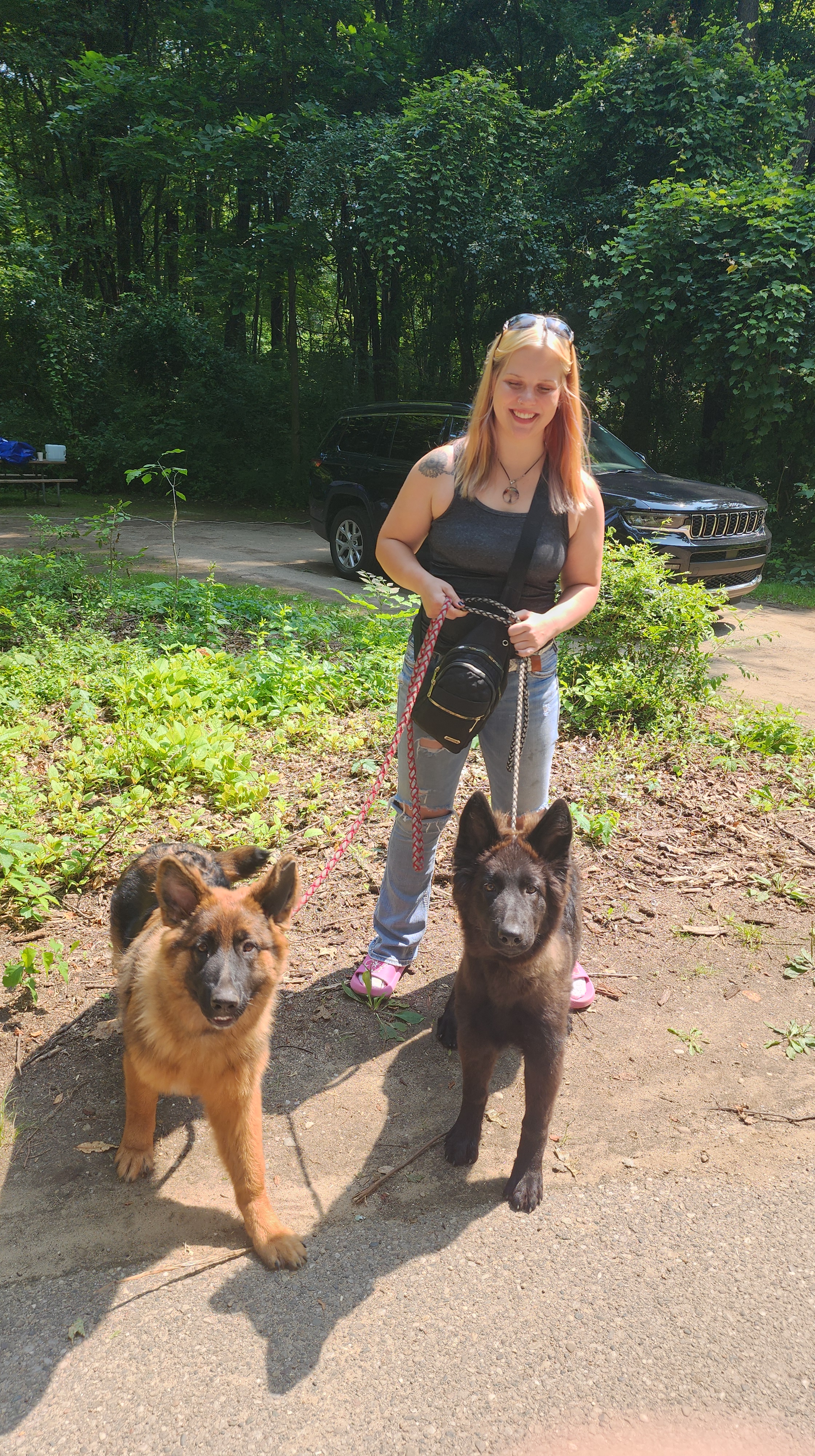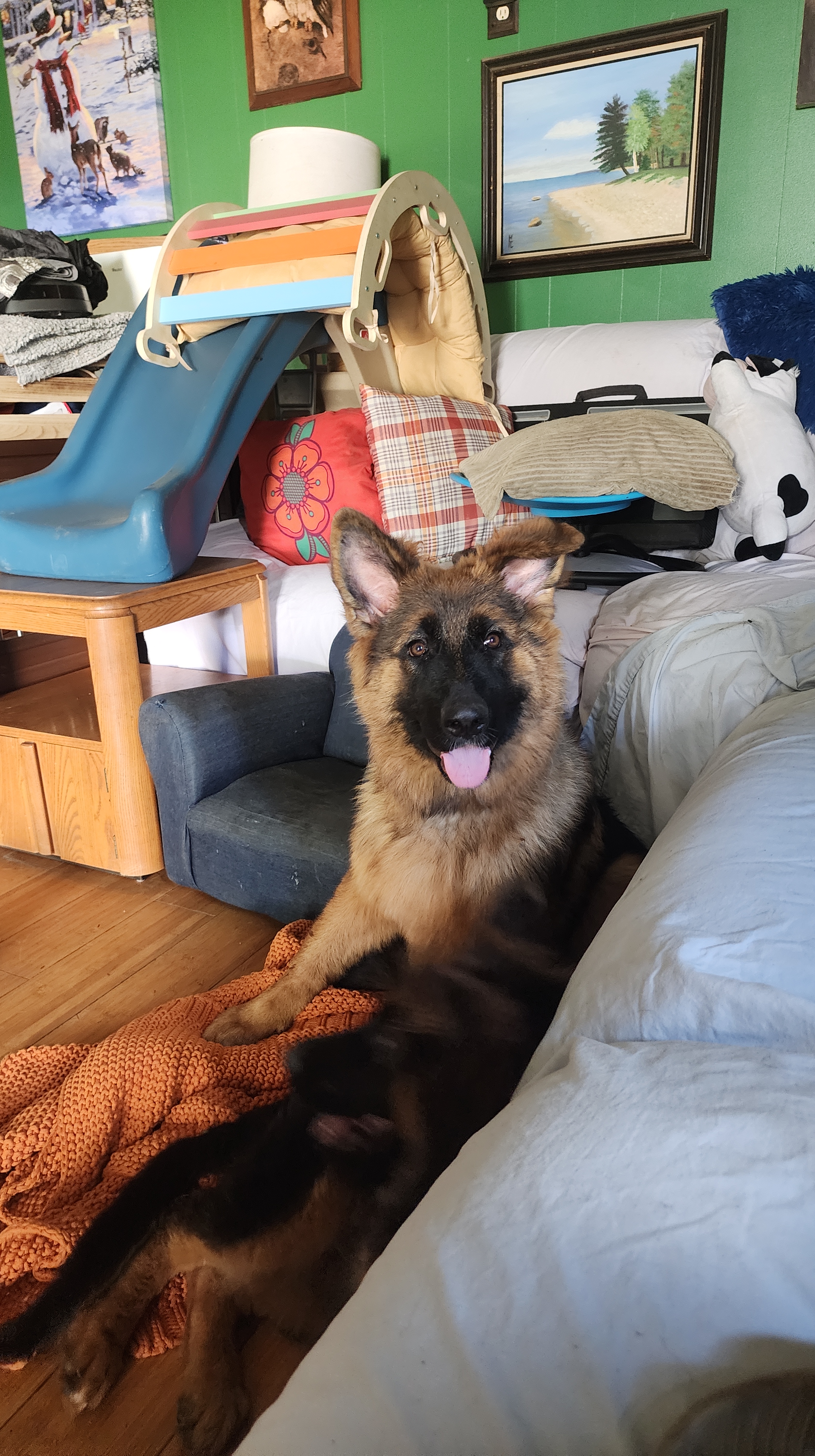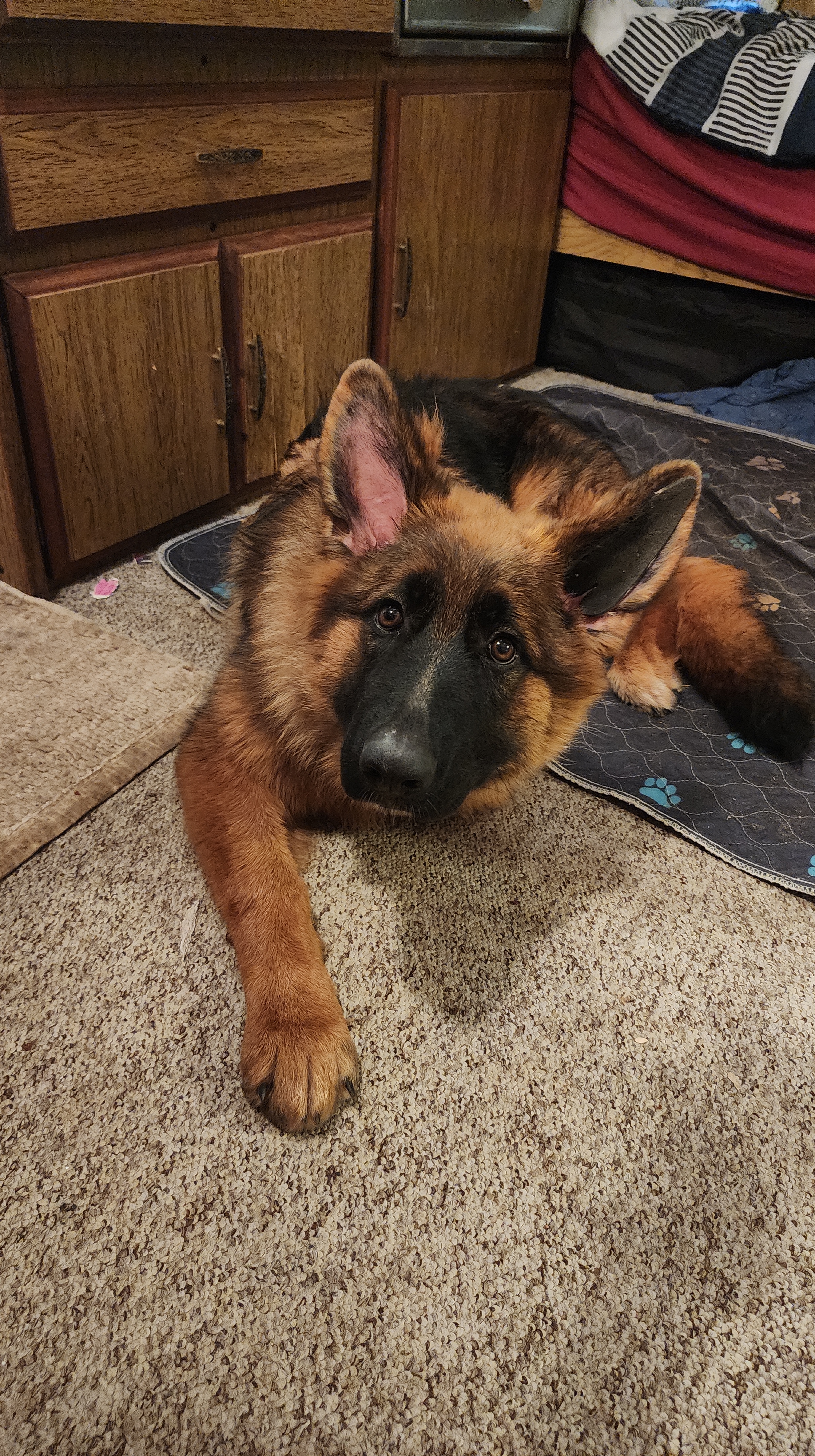 Another angel from Margel German Shepherds! She is a huge and fluffy sable girl. This quirky little weird girl is so fun lol. She’s a little bundle of love and weirdness haha. She is always doing such goofy things and making us laugh. She absolutely hates the heat and always wants to be laying in a cool spot in the air conditioning. When we went on our vacation to Michigan recently, the only thing she wanted to do was lay in the camper in the air conditioner cuz it was too hot out for her liking lol. She is very lazy and loves to nap. She is a mama’s girl and loves to wake me up in the morning by stomping on me. Can’t wait to see how big she will be and what she’ll bring to our breeding program 🙂